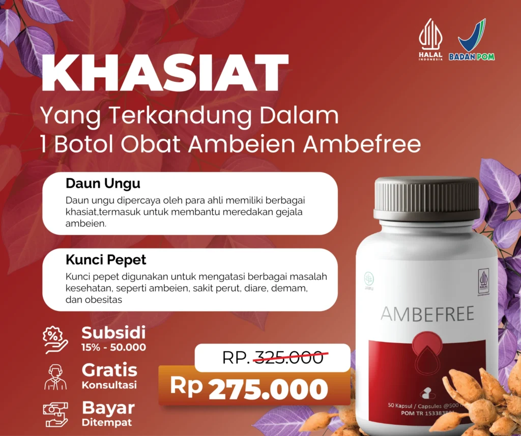 Obat Ambeien Ambefree merupakan Obat Ambeien Alami pertama yang terbuat dari bahan herbal tradisional. Obat Ambeien Ambefree efektif untuk menyembuhkan Sakit Benjolan Ambeien dan BAB Berdarah Karena Ambeien karena dibuat dengan bahan berkualitas dan Formula Obat yang 13x lebih ampuh untuk sembuhkan Ambeien. Dalam 3 Hari Sembuhkan Ambeien Anda Dengan Obat Ambeien Ambefree. Garansi Uang Kembali 100%